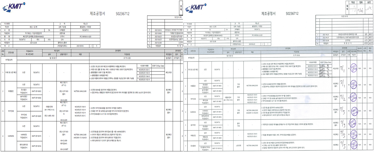 케이엠아이텍에서 생산되는 모든 제품은 제조공정(4M: Man, Machine, Material, Method) 을 안정적으로 유지, 관리하고 있습니다. 만약 제조 공정이 변경될 경우, 변경 계획 시부터 공정 안정 시까지 조직적이고 체계적인 품질 보증 활동을 실시합니다.